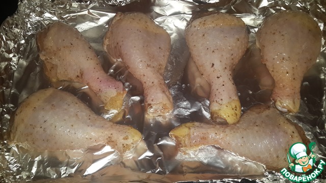 Голени помыть, посолить, поперчить. На противень положить формочку из фольги, смазать не много растительным маслом. Выложить туда голени, отправить в разогретую до 180-200 градусов духовку на 25 минут.