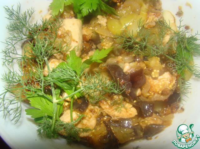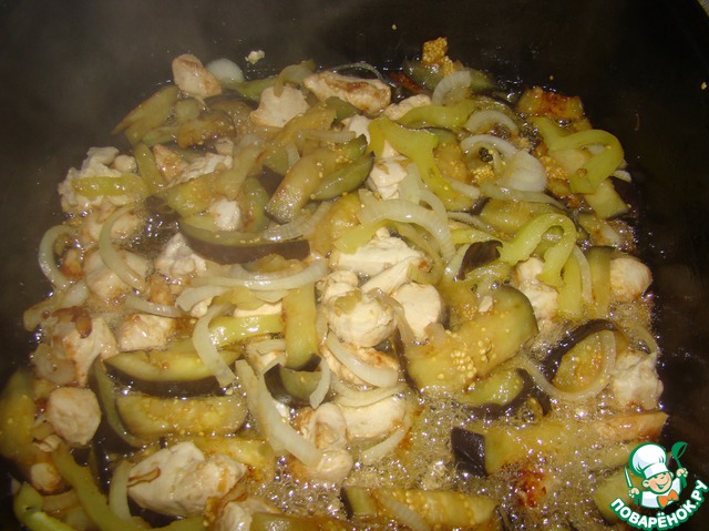 Обжариваем куриное филе, нарезанное кубиками, до румяной корочки, добавляем порезанные баклажаны, перец, лук (порезать соломкой или полукольцами). Обжариваем минут 10-15 до полуготовности, добавляем соль и перец по вкусу, уменьшаем огонь и накрываем крышкой. Доводим до готовности.