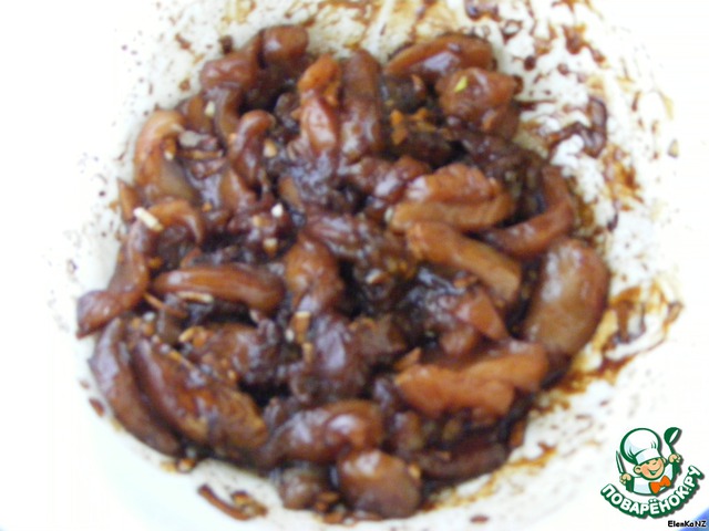 Нарезать мясо и перемешать с крахмалом. Чеснок, имбирь и чили порубить. Смешать с 1 ст.л. кунжутного масла и соевым соусом. Мясо мариновать в смеси 1 час.