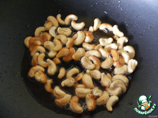 Разогреть растительное и 1 ст.л. кунжутного масла. Обжарить на нем кешью и вынуть их. Обжарить в том же масле мясо. Посолить, поперчить и вынуть из сковороды.