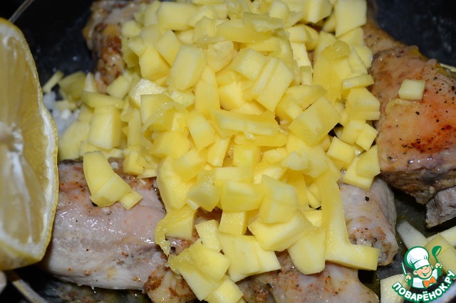 Мякоть манго рубим ножом, выкладываем к голеням. Добавляем лимонный сок.