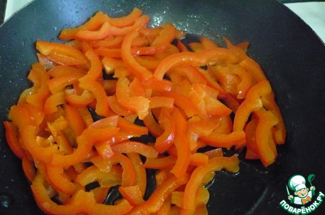 Перец режем соломкой и обжариваем с 2 ст. л. масла тоже до полуготовности. Перекладываем к луку.