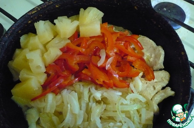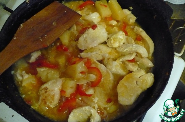 Кладем овощи в сковородку с курицей. Добавляем ананас вместе с сиропом и тушим 5 минут под крышкой на маленьком огне.