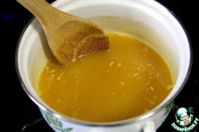 Смешиваем апельсиновое варенье, апельсиновый сок и мед и нагреваем на среднем огне помешивая до однородности.