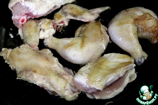Разогреваем сковороду с оливковым маслом и слегка обжариваем куски курицы сначала кожей вниз до чуть золотистого цвета, а потом перевернув, с другой стороны.
