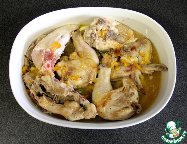 В огнеупорную форму сначала кладем апельсины, порезанные кольцами. Чеснок мелко режем или измельчаем в чеснокодавилке и кладем на апельсины, затем веточки розмарина и сверху куски курицы кожей вниз и поливаем приготовленным апельсиновым соусом. Солим и перчим по вкусу.