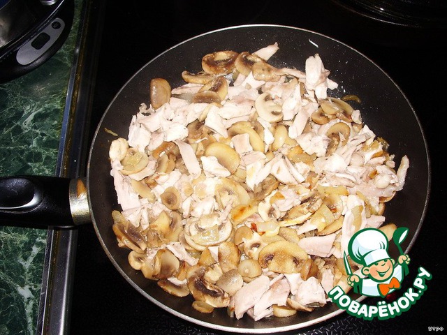 Режем шампиньоны, лук, отварную курицу и обжариваем. Если курица сырая, то просто обжариваем до готовности курицы.