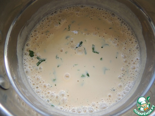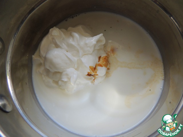 Готовим соус. Смешать в кастрюле молоко, сметану и соевый соус Kikkoman.