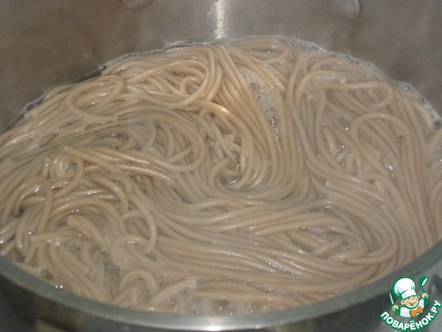 Отварить лапшу в кипящей подсоленной воде до готовности.