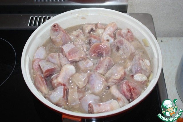 Выложить курицу и залить вином. Тушить под крышкой на среднем огне 20-30 минут.