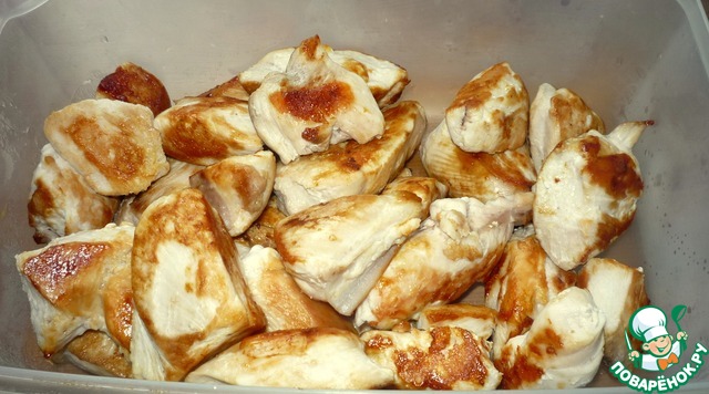 Мясо промыть под проточной водой и просушить бумажным полотенцем. Нарезать на порционные кусочки (можно брать любую часть курицы, но я люблю только белое мясо). Обжарить их на сухой сковороде на среднем огне. Сначала мясо, конечно, пристанет к сковороде, но когда подрумянится, то само отойдет от поверхности.