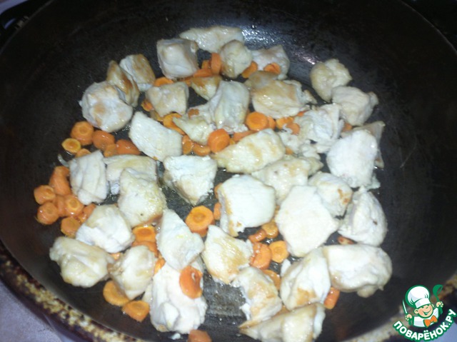 Очистить, промыть курицу, нарезать ломтиками по 2-3 см, до размягчения потушить на слабом огне.