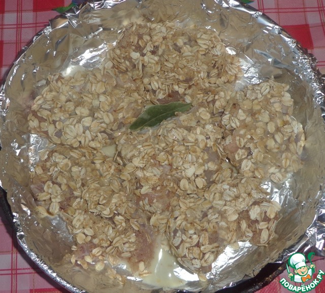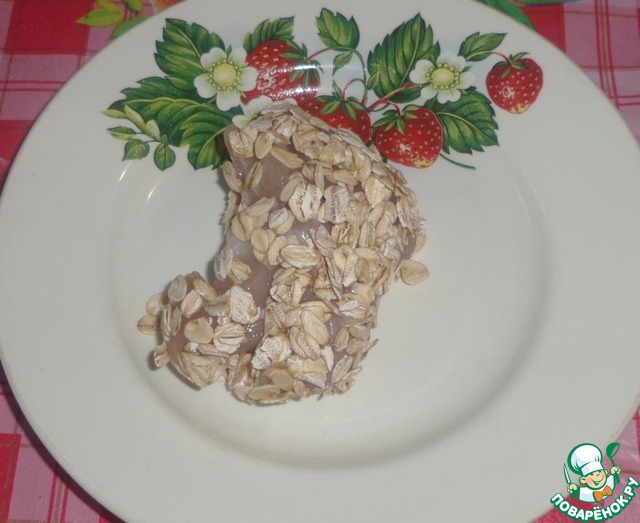 Мясо обмакнуть в яично-молочную смесь, затем в овсяные хлопья перемешанные с панировочными сухарями.