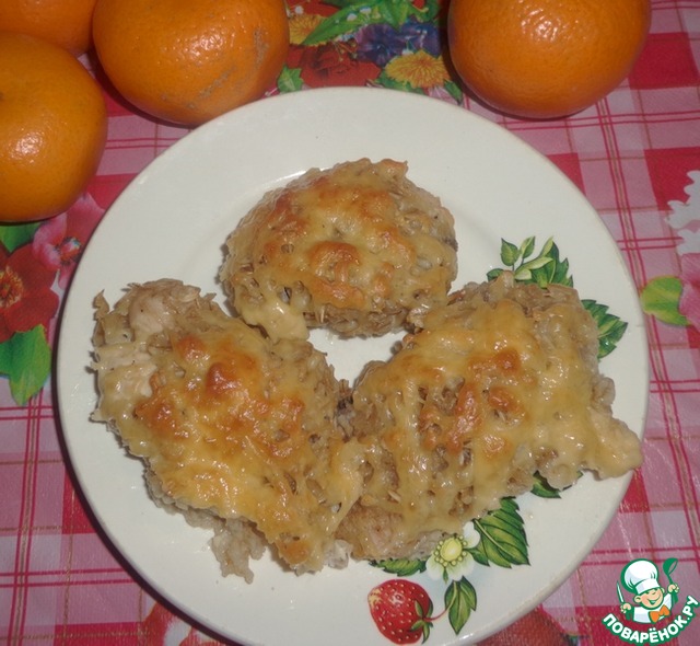 Когда наггетсы будут готовы, посыпать сыром, натертым на крупной терке и поставить в духовку для того, чтобы сыр расплавился.