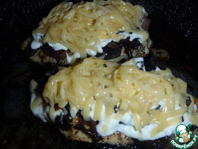 Далее на каждый кусочек филе кладем по половине обжаренных грибочков, поливаем это все сметаной или йогуртом, по необходимости присаливаем и посыпаем тертым сыром и зеленью.