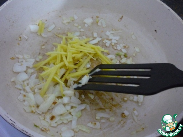Обжарить лук до золотистого цвета и добавить к нему имбирь. Обжарить еще несколько минут и выложить в отдельную посуду.