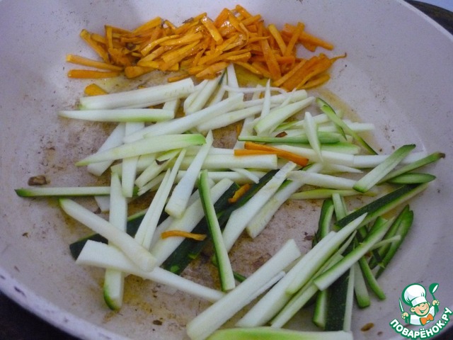 Затем на той же сковороде обжарить морковь до мягкости, сдвинуть ее и тут же обжарить цукини до мягкости. Выложить в отдельную посуду.