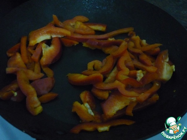 Обжарить перец, выложить в отдельную посуду. Прошу прощение за фото, торопилась запечатлеть весь процесс и было не до супер-ракурсов.