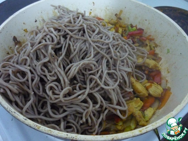 Через несколько минут добавляем к мясу и овощам лапшу, тщательно мешаем, накрываем крышкой, выключаем плиту и даем немного настояться.
