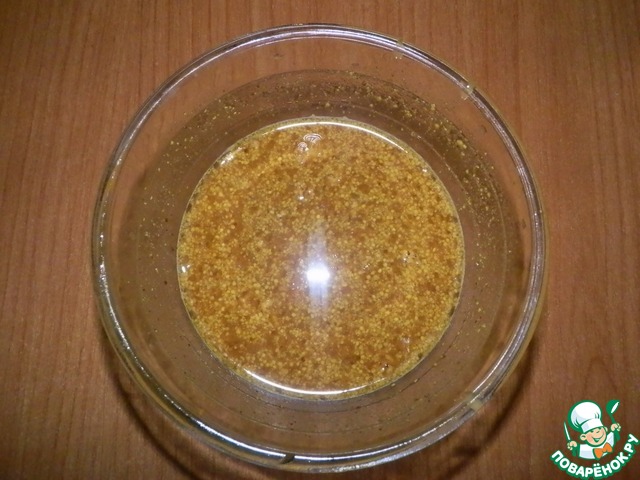К соку добавляем соевый соус ТМ Kikkoman, французскую горчицу и мёд. Перемешиваем. Обязательно пробуем соус на вкус. Он должен быть довольно острым. При необходимости добавляем тот или иной ингредиент.