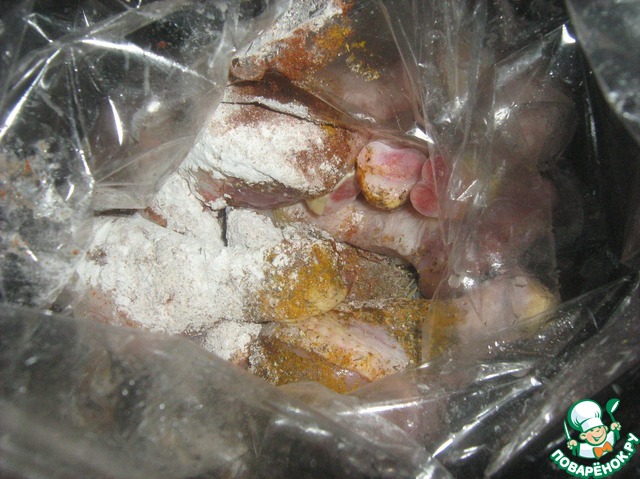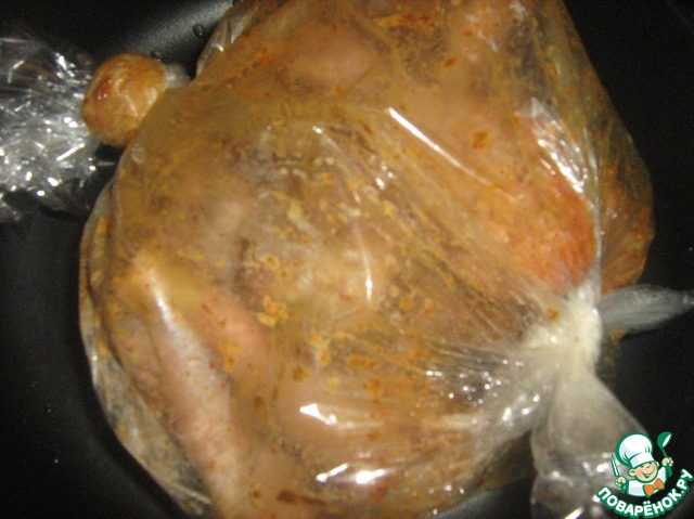 Плотно закрепить пакет с двух концов и хорошо потрясти, для того чтог бы специи распределились равномерно, и поставить в духовку на 200 гр. минут на 40-50.