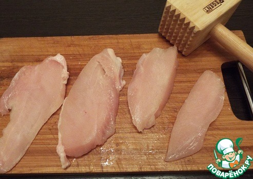 Куриную грудку нарезаем тонкими пластинками, немного отбиваем и маринуем в майонезе 30-40 минут.