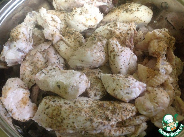 Охлажденную курицу очищаем от кожицы и хорошо обмазываем каждый кусок специями
