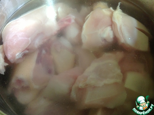 Курицу порционно разделываем и ставим варить на 15 минут (без всяких специй)