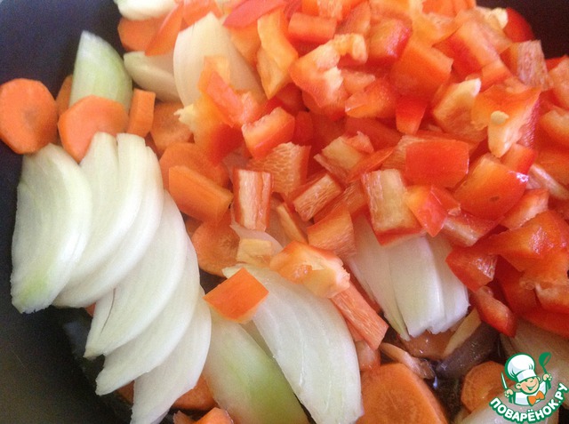 Лук режем полукольцами, перец мелкими кубиками и добавляем к моркови с 1 ст. л. оливкового масла