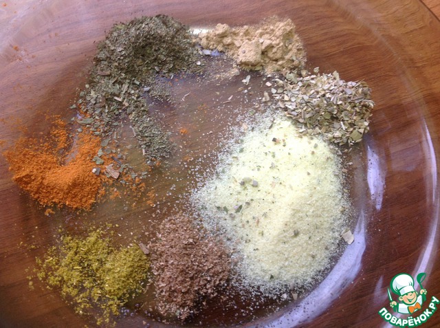 Насыпаем в тарелку все вышеперечисленные специи и перемешиваем их
