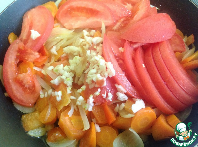 Когда наши овощи потушились минут 10, добавляем к ним мелко рубленный чеснок и тонко нарезанный полукольцами помидор, и тушим еще 5 мин