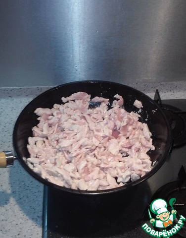 Куриное филе обжариваем в подсолнечном масле на сильном огне. Вынимаем и кладем в миску.