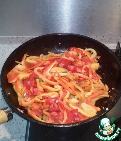 Обжариваем нарезанные овощи (перец болгарский, острый, помидоры) с соевым соусом около 5-6 минут, постоянно помешивая. Вынимаем и кладем в миску.