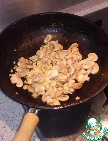Две минуты обжариваем грибы на сильном огне. Добавляем к ним нарезанный имбирь.