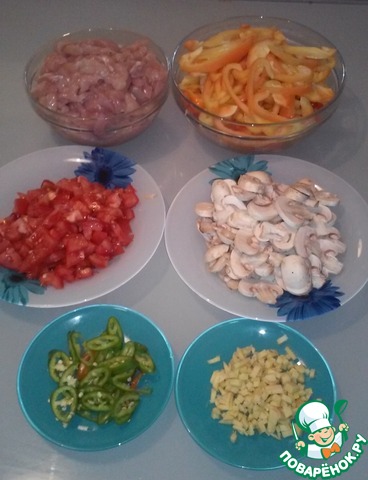Куриное филе нарезаем небольшими кусочками (толщиной 5мм), перец болгарский нарезаем тонкими длинными полосками, помидоры нарезаем кубиками, нарезаем грибы, кольцами режем острый перец, мелко рубим имбирь.