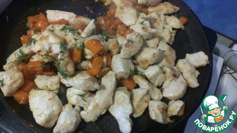 Бросаем нашу курочку на сковороду и обжариваем до слегка золотистого цвета. После чего на этом же масле я обжариваю тыкву, которую нарезаю кубиками. Муж у меня не фанат тыквы, по-этому кусочки небольшие. Тыкву я обжаривала где-то минут 3-5 и после чего обратно добавила туда курочку. Всё это минуты 3 обжарилось вместе. Добавила укропчик и готово!