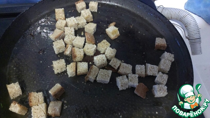 Обжариваем на том же масле хлебушек. Делаем сухарики, но не очень хрустящие.