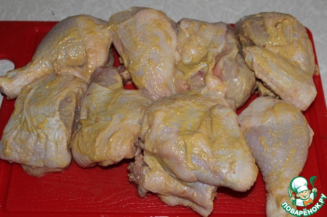 Курицу разрезать на 8 частей и смазать каждый кусок горчицей. Положить в глубокую сковороду и обжарить до золотистого цвета, наблюдая чтобы горчица не подгорела.