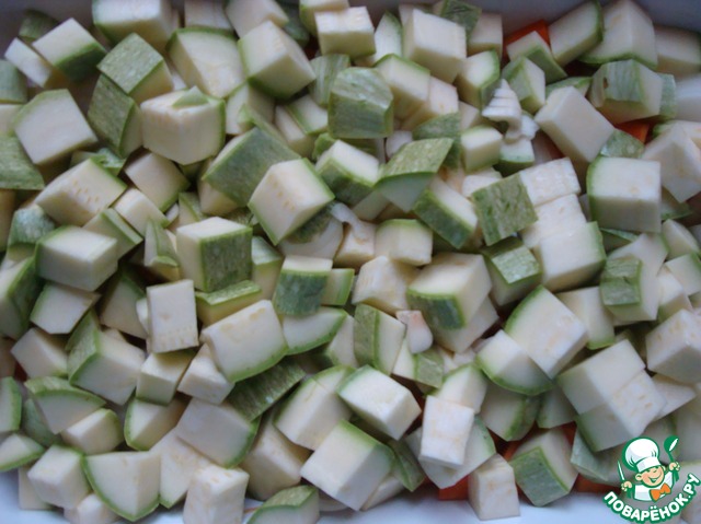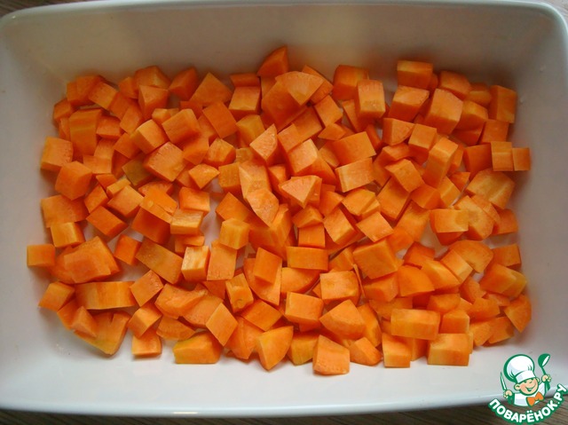 Нарезаем морковь средним кубиком и кладем в форму для запекания.