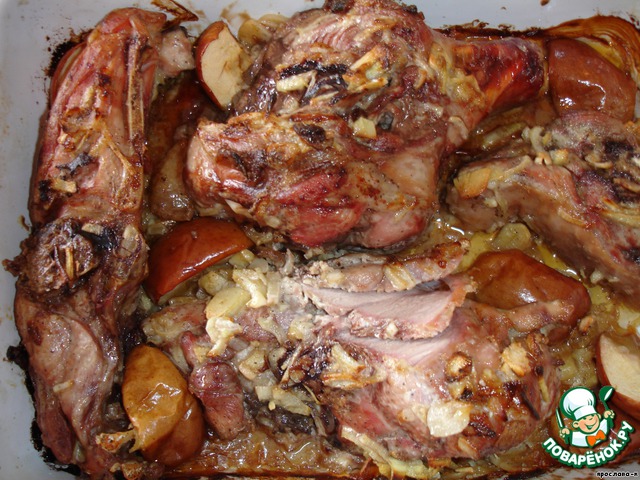 Выложить на противень ножку вместе с маринадом, вокруг выложить нарезанные яблоки (это даст особый вкус мясу).