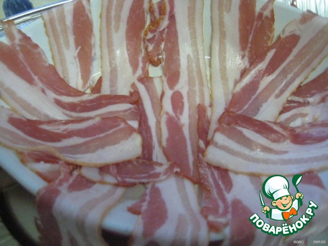 На огнеупорное блюдо выкладываем полосочки грудинки (как на фото).