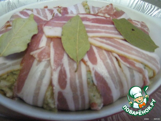 Полосочки грудинки заворачиваем, сверху лавровый лист и выпекаем на паровой ванне в духовке 1 час при 160-180°C.