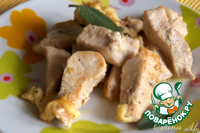 В сковороде растопить сливочное масло, добавить шалфей. Через 2-3 минуты добавьте индейку и сало.