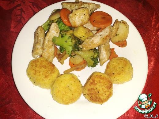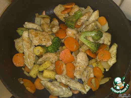 | Изюминка рецепта в способе приготовления мяса. Сухая курятина и индюшатина получаются необыкновенно сочными. Овощи и гарнир можно выбирать на свой вкус. |