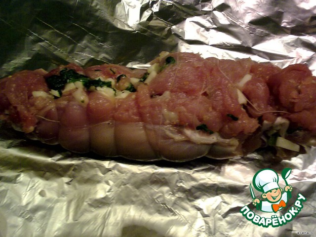 Свернуть рулетом, обвязать ниткой. Завернуть в фольгу и запекать в духовке при 220* минут 15. Раскрыть фольгу и подрумянить (примерно минут 10). Духовки у всех разные, надо смотреть, чтобы выделяющийся сок был прозрачным. Готовый рулет вынуть из духовки, снять нитку и нарезать ломтиками.