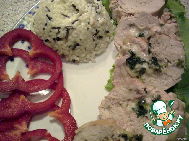 | Рулет из индюшиного филе с моцареллой и шпинатом, с чудесным сливочным соусом и отварным полудиким рисом. Оригинальное праздничное блюдо, подойдет также и для повседневного ужина. Может кому приглянется. Заходите и отведайте |