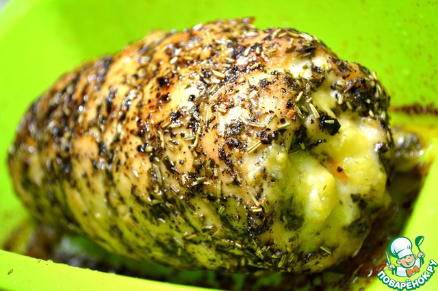 Филе свернуть аккуратно рулетом и закрепить. Обычно я обвязываю рулеты зубной нитью, она не плавится, не горит, никакого мятного вкуса на мясе не оставляет и легко снимается, не повреждая мясо. Рекомендую ))) Подготовленный рулет замариновать в подготовленной смеси и дать постоять хотя бы 15 минут.