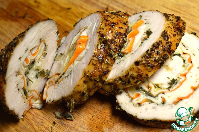 Нарезаем на порционные кусочки шириной около 1-1,5см и подаем к столу. Если Вы хотите использовать рулет в качестве закуски или как полезное мясо для бутербродов, то следует дождаться его остывания и нарезать тоньше. В таком случае в качестве дополнительного соуса отлично подойдет зернистая горчица.
