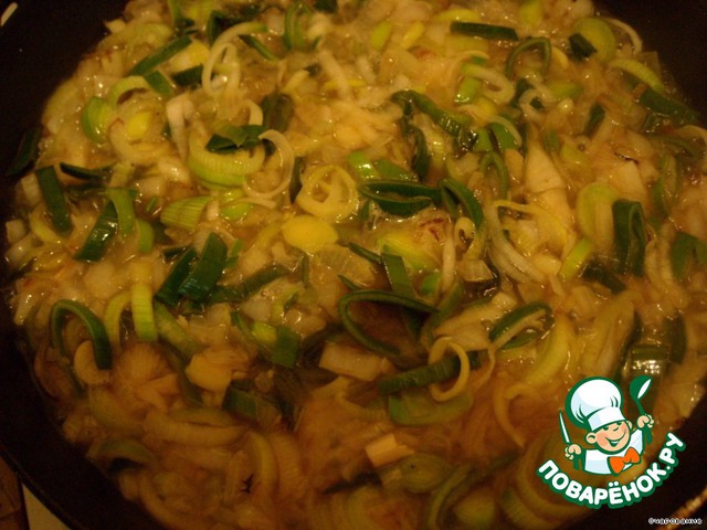 Лук репчатый и лук-порей нарезать кольцами, обжарить, залить вином и потушить 5 минут.