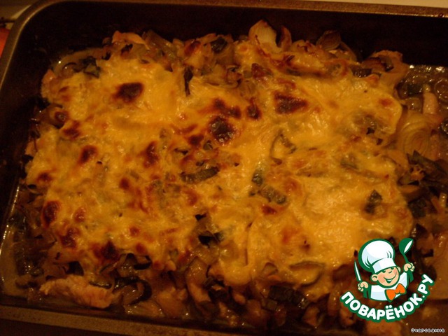 Филе индейки вымыть, нарезать соломкой, посолить, поперчить и обжарить, сок от жарки слить, а филе переложить на противень или в форму.